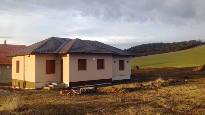 A szaniterek bekötése, a konyhabútor összerakása és a berendezése már nem része az építkezésnek, azt nem posztolom. A jó idő beköszöntével megkezdődő tereprendezést, vízelvezetés rendszerének kialakítását (legalább egy 5 köbös műanyag, földbe süllyesztett tartályra lesz szükségünk a domborzati viszonyok miatt, hogy ne áztassa a csapadék a falakat…), a járdák, terasz stb., és a továbbiak már szintén nem tárgyai a blognak.