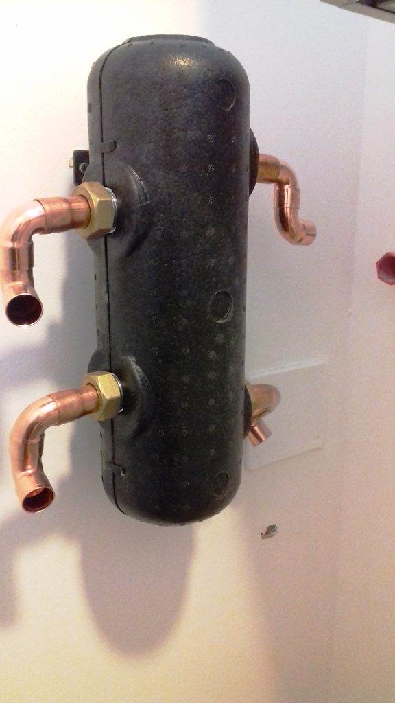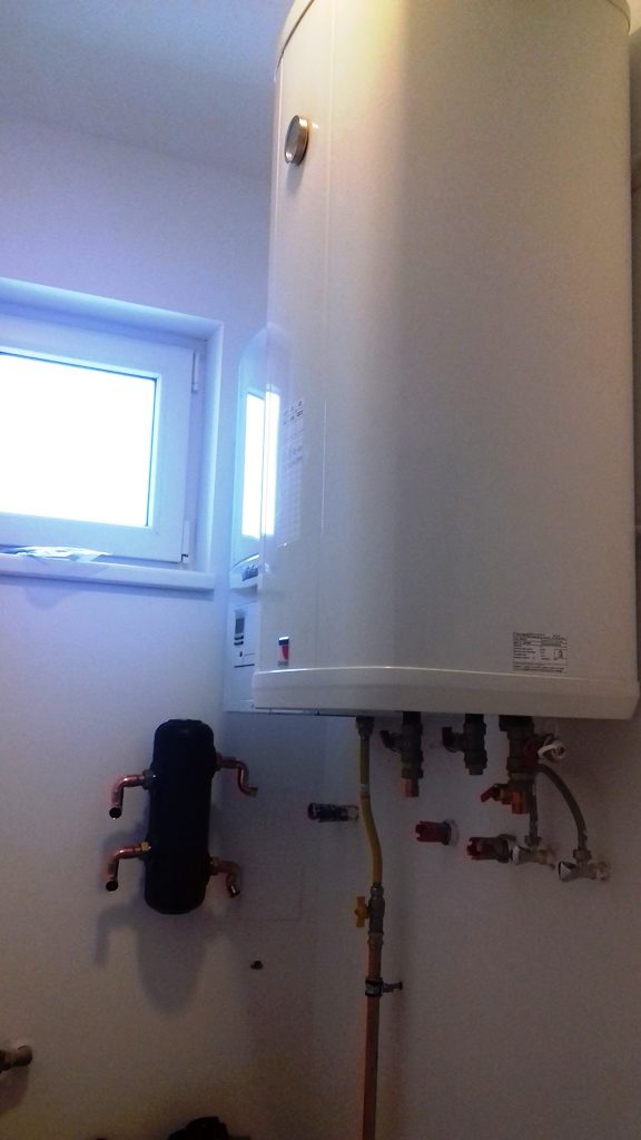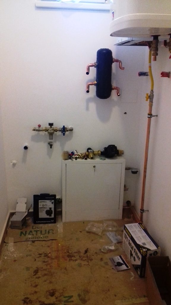 Hosszú várakozás után megkezdődött a gázszerelés. Illetve folytatódott a tavasszal megkezdett munka. Egy galériába szedem mi történt a kívül és belül. Felkerült a kondenzációs kombi falikazán és a melegvíz tároló. A fekete színű átfolyó a fali törölközőszárítós fűtőtestek melegebb (kb. 55 fokos) vizéért felel. A padlófűtés rendszerébe ugyanis kevesebb ennél (kb. 35 fokos). Előkészítették a vízlágyító rendszer telepítéséhez szükséges csatlakozást. A rendszer úgy néz majd ki, hogy a fürdőszobákba és a kazánon keresztül, illetve a konyha mosogatógép csapjához is lágyított víz kerül. A konyhai hideg víz lágyítatlan lesz. Így a kazán, a csaptelepek, a mosogatógép és a szaniterek élettartama nem rövidül. A konyhai mosogatótálca és a csaptelep gránit és kerámia őrleményből álló anyaga talán jobban ellenáll a vízkőnek, mint egy rozsdamentes felületű tálca. Látványra mindenképpen…