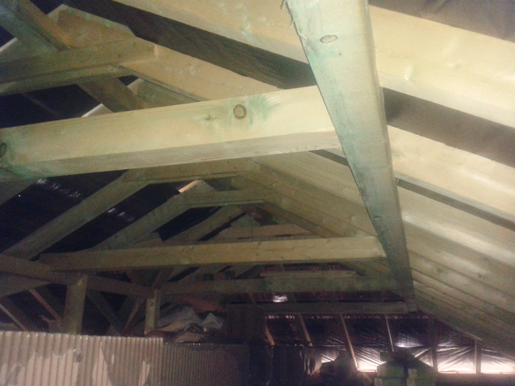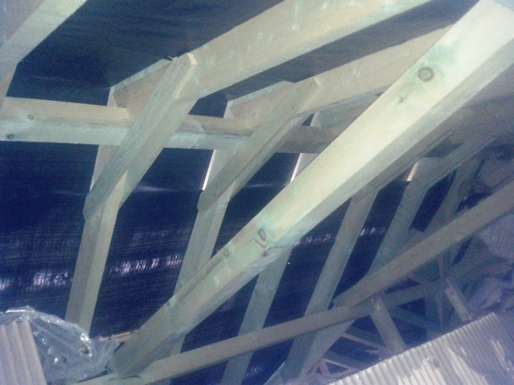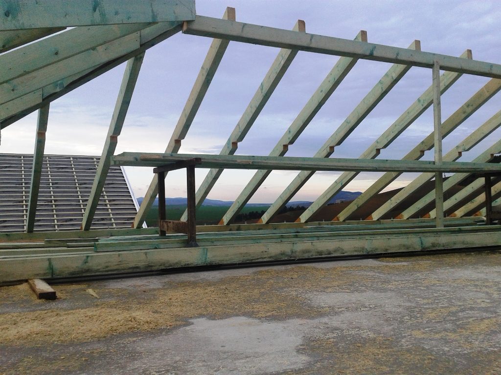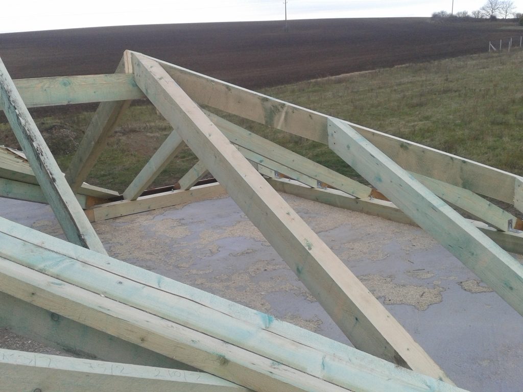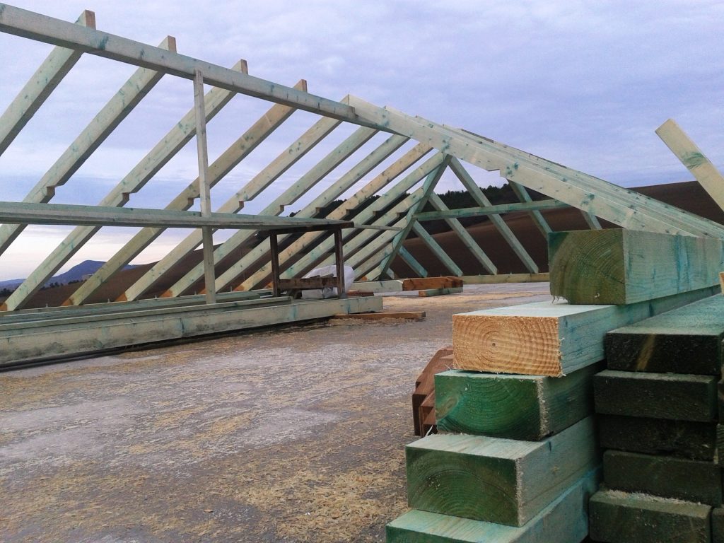 A gerendák szabása után eddig jutottak a mesterek. Jól látszik az összetett tető majdani szerkezete.