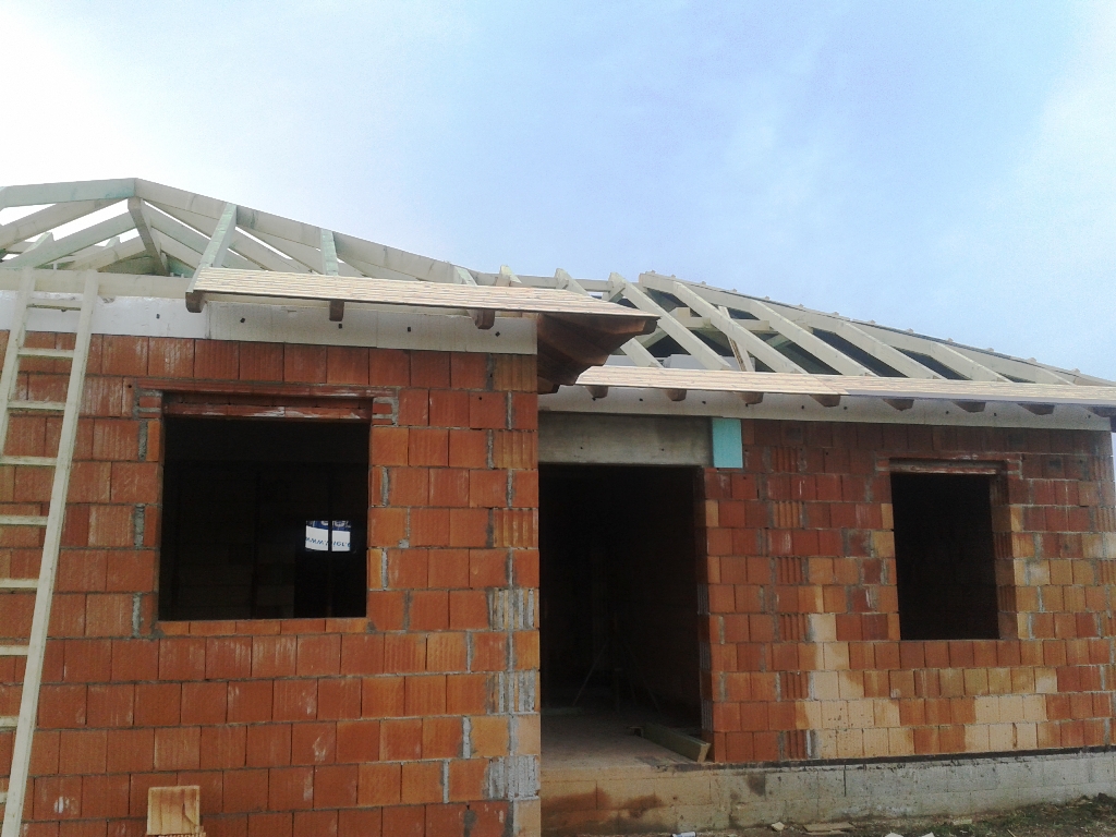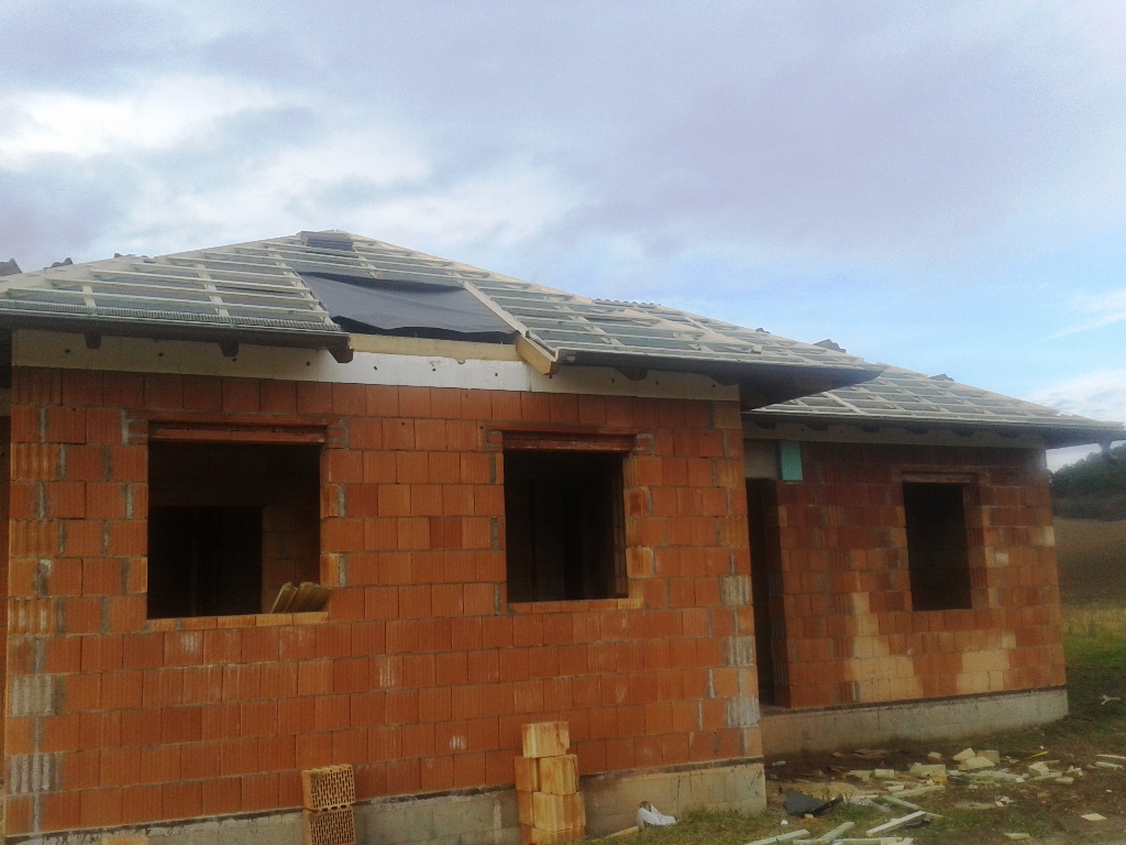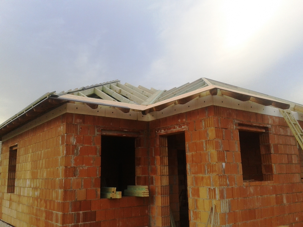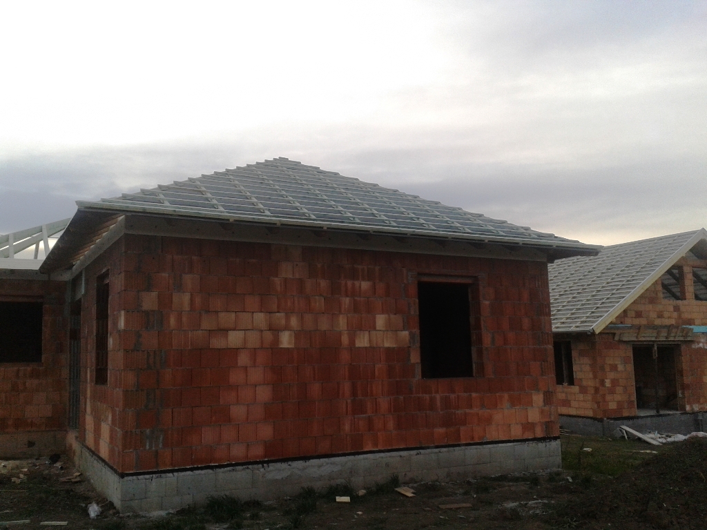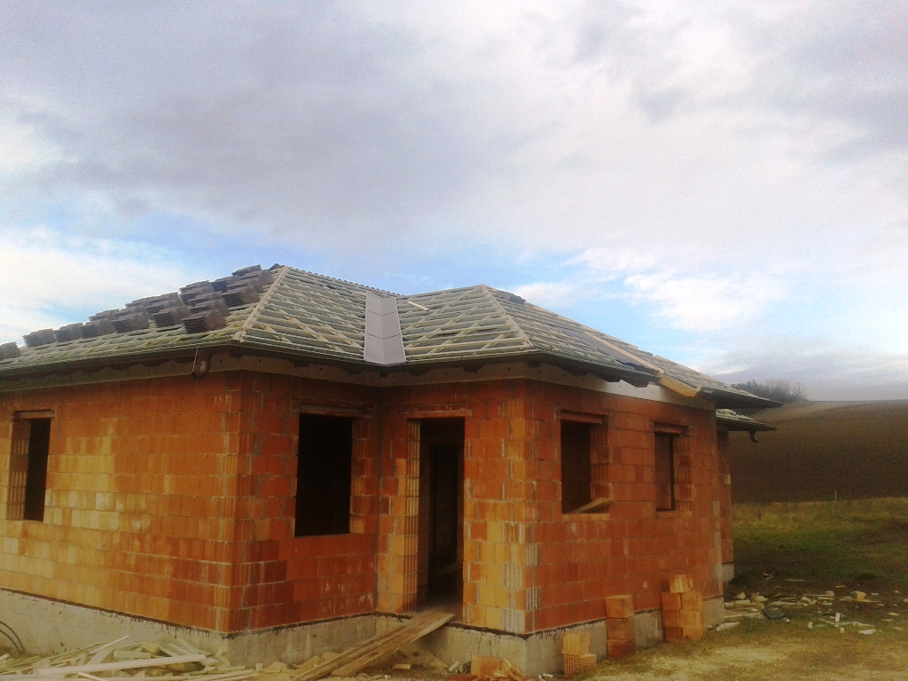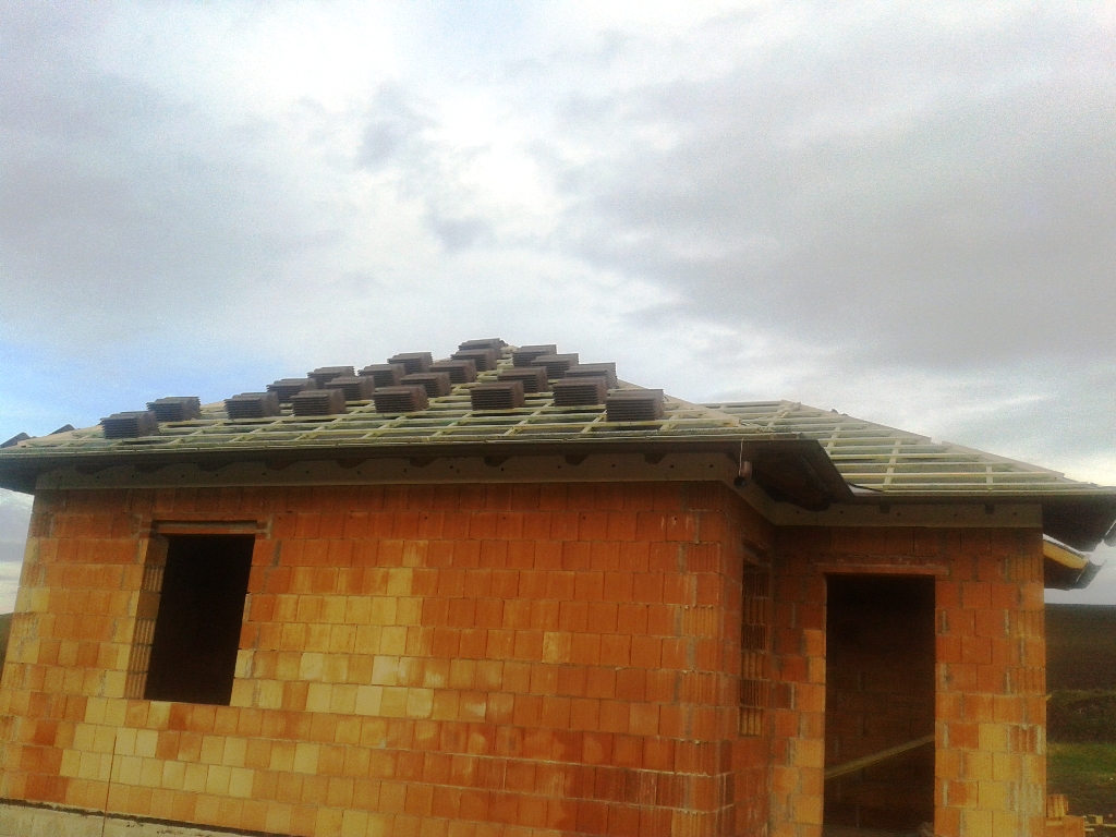 A fóliázás és a lécezés után vagyunk. Megkezdődött a cserepezés. Az ereszezés készen van.