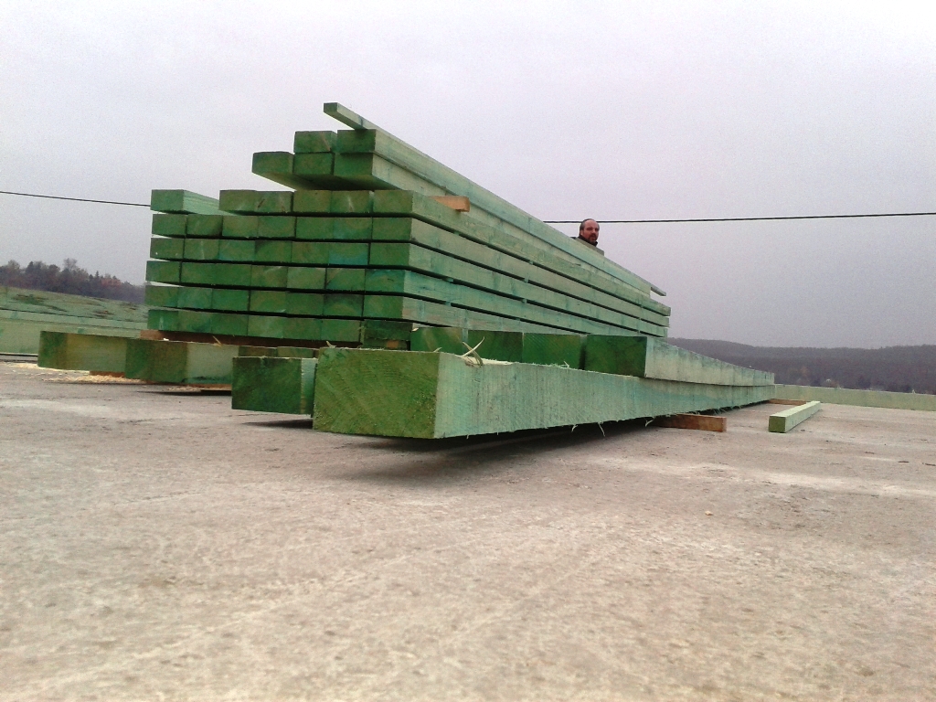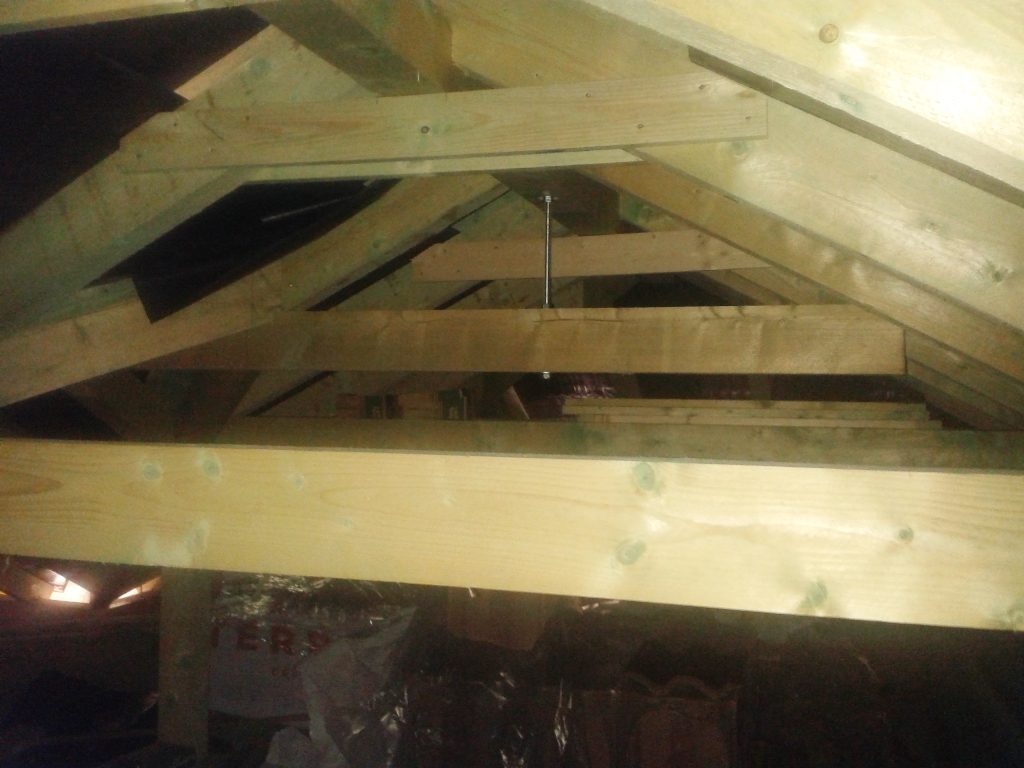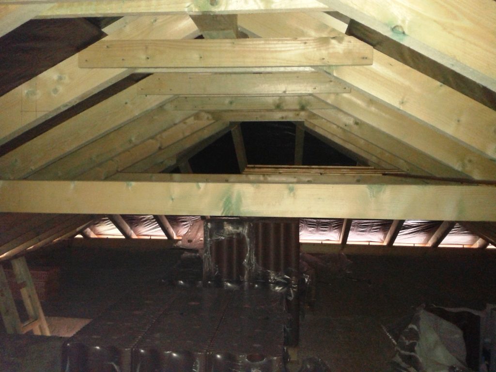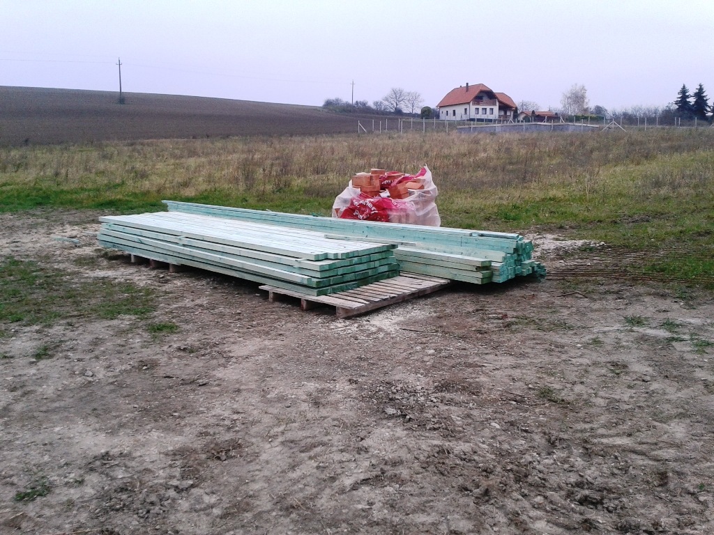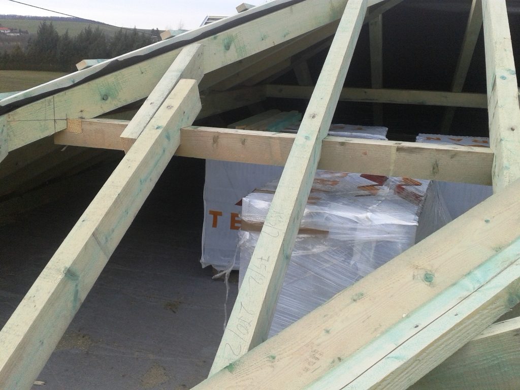 Az ácsmunka folytatódik: 3 oldalon már fent van a párazáró fólia, a cserép a födémre van daruzva, a gerendázat kész, a lécezet is szépen mutatja magát.