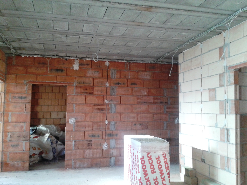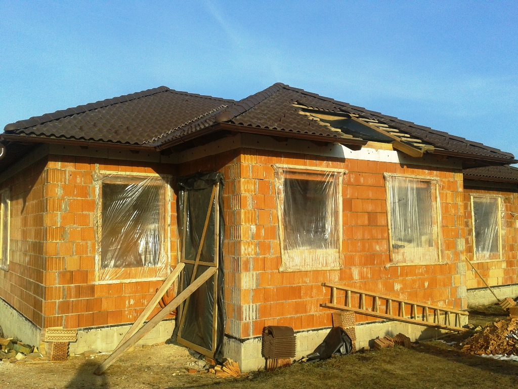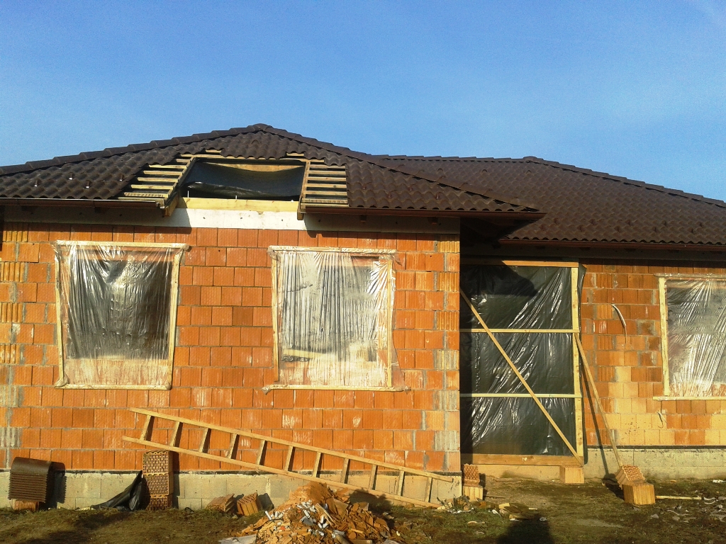 Ma 7 hónapja kezdődött az építkezés. A kitűzéstől eljutottunk az alapásásig, a zsalukövezésig, a falazásig, a födém kiöntéséig, a válaszfalakig, a tetőszerkezet megépítéséig, a cserepezésig, a villanyszerelésig, a vakolásig, a gipszkartonozásig, vízszigetelésig, hamarosan a vízvezetékek és a fűtésrendszer kiépítése kezdődik meg. Jönnek az ablakok, terveztetjük a riasztórendszert.